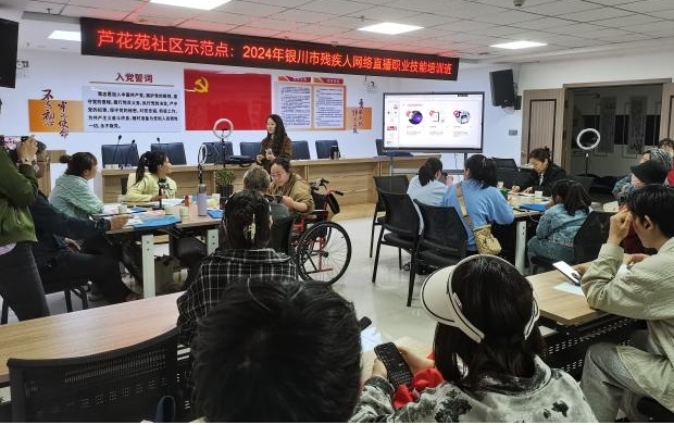“直播间的家人们,这款产品非常畅销,口碑很好,大家可以放心购买……”5月初,在位于贺兰山西路街道的西夏区芦花苑社区“残疾人之家”,宁夏西部职业技能培训学院讲师龚佩佩一行人正在为残疾人开展为期一周的网络直播技能培训。培训结束后,宁夏一家企业老板主动找到了参加培训的罗娜等残疾人,提出愿意资助她们进一步学习直播带货等技能,未来合伙创业。