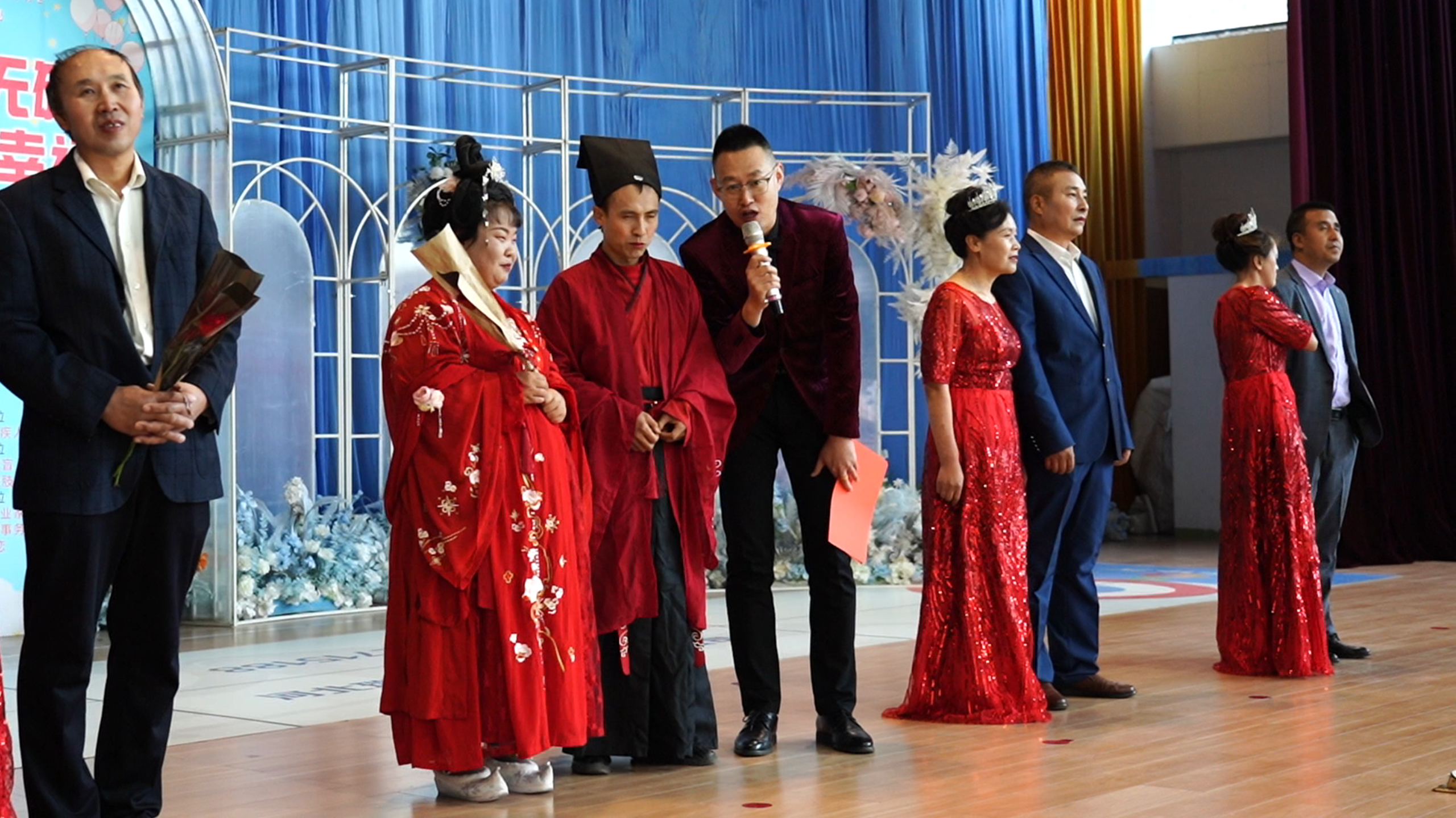 活动首先邀请了四对已经结婚的夫妇和准备结婚的新人,站在台上为大家介绍恋爱经历。家住西夏区的王娟和肖刚夫妇穿着古装来的,他们是四对中一对,结婚四年了,都是视力残疾人,在盲人按摩店相识相知相爱后终成眷属。活泼可爱的王娟和腼腆内向的肖刚虽然性格反差比较大,但彼此的默契和谐总让人想到“恩爱”二词。王秀斌和田勇霞两人是从海原县赶来参加活动的。他俩也是视力残疾,11月8日才订的婚,准备年底结婚。田勇霞话不多,王秀斌主动介绍了他们的恋爱经历:“因为我是盲协的骨干,在工作中很早就认识了田勇霞,发展成恋爱关系就是在9月份自治区残联举办的培训班上,现在我们很甜蜜、很幸福。”