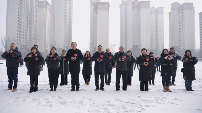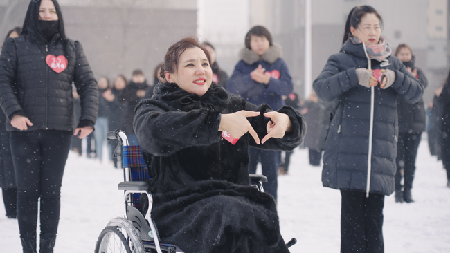 图为3月1日,新疆残联班子成员迎着风雪带领大家用手语“送祝福”