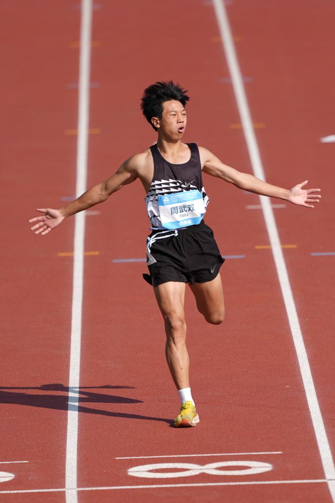 12月12日,贵州队选手周武双在男子12-15岁组400米预赛第4组比赛中,即将冲过终点时庆祝。新华社记者 杨晨光 摄