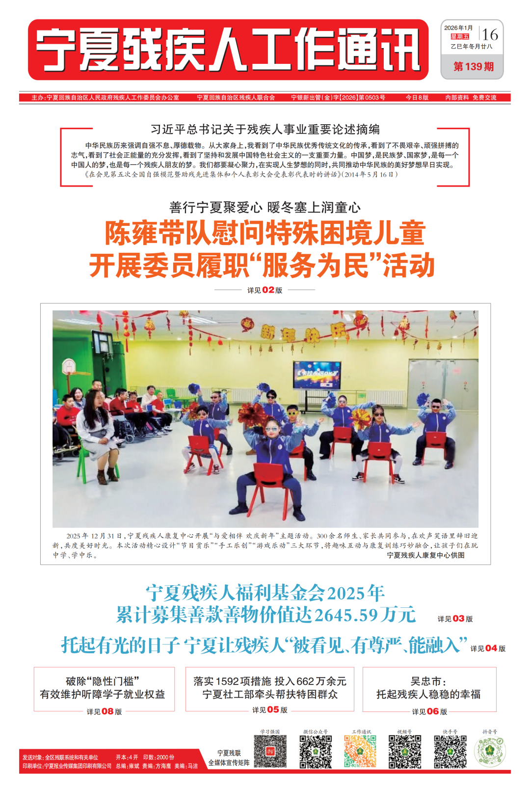 政策直通车 暖宁助残・权益守护案例集 深入学习贯彻党的二十大精神 深入学习贯彻自治区第十三次党代会精神 宁夏残疾人工作通讯杂志 全国保密宣传教育月活动 助残日活动 视听在线 首页首页>专题 > 宁夏残疾人工作通讯杂志 宁夏残疾人工作通讯第141期 宁夏残疾人工作通讯第140期 宁夏残疾人工作通讯第139期 宁夏残疾人工作通讯第138期 宁夏残疾人工作通讯第137期 宁夏残疾人工作通讯第136期 宁夏残疾人工作通讯第135期 宁夏残疾人工作通讯第134期